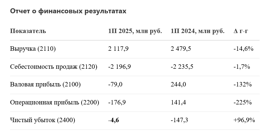 2. Чистый убыток: 4,6 млн руб. (улучшение vs. -147,3 млн руб. в 1П 2024 г.).