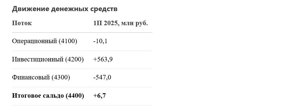 4. Сальдо денежных потоков: +6,7 млн руб. (vs. -19,9 млн руб. в 1П 2024 г.).